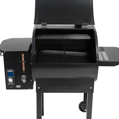 Enjoy the savory flavor of smoky BBQ with all of your favorite meats. Camp Chef’s innovative Pellet Grill and Smoker Deluxe simplifies the process of smoking. Digital heat control automatically feeds pellets to maintain temperatures and infuse that satisfying taste. With the push of a button you can check cooking temperature or internal meat temperature. A grease drain system and removable ash can conveniently collect waste for easy clean up. A stainless steel design embellishes this grill to reflect its superior cooking abilities. Full cooking range from low to high smoke or 160 to over 400 degrees. Discover the real secret of award winning BBQ, low and slow smoking.