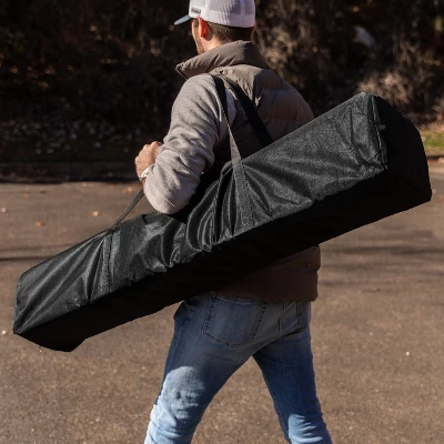 Portable shelters are an excellent way to provide shade during outdoor events and this black all-weather 10′ x 10′ pop up canopy tent will help keep you out of the elements so you can enjoy your time with family and friends. The weather resistant polyester top has reinforced corners to prevent ripping or tearing and is UV coated to resist fading from the sun’s rays. Simply unfold the fabric top, attach to the upper frame with the hook and loop fasteners, extend the bottom legs and pull open for instant protection. Strength and durability abound in this instant canopy. The white powder coated steel frame is rust and corrosion resistant and locks in place with a “pinch free” locking mechanism. The height adjustable frame takes you from the backyard to the beach and everywhere in between. This canopy pop up tent folds up when not in use and has its own bag for easy storage. This quick shade canopy includes the frame, canopy top and stabilizing ground stakes. Assembly takes less than 10 minutes and does not require tools. Take this portable shade canopy on camping trips, tailgating, the kids soccer games or for get togethers on your patio or in the yard. This party canopy tent will look great season after season. Additional Features: Height Adjustable Powder Coated Frame is weather and rust resistant, Assembles in 10 Minutes or Less; Includes Ground Stakes to anchor the structure; String Size (8): 118″, Seating Capacity with 8′ Folding Table: 10; Standing Capacity: up to 20, All Occasion Pop Up Party Canopy Tent ideal for family reunions, neighborhood block parties, tailgating, camping or as shade on your deck or patio