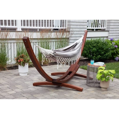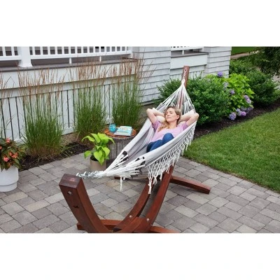 The Brazilian outdoor hammock adds comfort to the quality time that you spend outdoors. This versatile double hammock for the outside can accent your patio furniture, add more comfort to your backyard, or be your go-to lounge spot on the porch. Bring it along while traveling and relax near the campfire with this comfortable tree hammock. The durable patio swing has been handcrafted with a high-grade polycotton fabric and will add a bit of luxury to your life. Take a moment to enjoy the simpler things in life while you sit back and relax on this 52 x 79-inch two-person hammock. This traditional South American hammock will take the shape of your body contour. Spend time relaxing solo or swinging with others, this patio hammock swing has a weight capacity of 250 pounds. HAMMOCK STAND SOLD SEPARATELY!