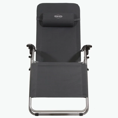Experience the weightless sensation of the Kamp-Rite Reclining Zero Gravity Chair and feel your stress melt away. This anti-gravity chair is great for the beach, campsite, tailgating, or relaxing on a sunny day in the back yard. A removable and adjustable pillow provides a soft place to rest your head. This portable folding chair reclines smoothly into multiple positions with dual adjustment levers located below each arm rest. Elevate your feet to the same level as your heart to reduce strain on your back and improve circulation.Constructed from strong-yet-lightweight, powder-coated the steel frame chair is easy to fold and carry. The camping chair holds up to 300 pounds, making it a sturdy piece of camp furniture for adults and children.Recharge, relax, and enjoy your time in the backyard, patio, or campsite on the Kamp-Rite Reclining Zero Gravity Chair.