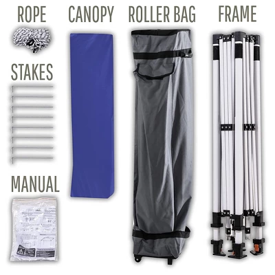 Upgrade your backyard party and enjoy the shade with the 10 Foot x 10 Foot Instant Shade Canopy from OneTouch. This blue canopy tent sets up in minutes to provide you with a functional sunshade ideal for any outdoor event.Featuring the original Center Lock Technology, this canopy tent locks in place with a single button. Simply release the button for an instant and easy takedown. The tent’s durable roof can support up to 120 pounds of pressure, making it the perfect shelter for when rain or snow encroaches on your outdoor event. The large surface area of the tent comfortably provides shade for 6-8 adults. 3 height adjustments with pinch-free push buttons allow you to easily adjust leg heights for a solid, secure base on all surfaces.When you’re ready to pack up, the tent includes a handy wheeled roller bag that makes transportation and storage a breeze. Next time you’re planning an event, trust in the style and function of the Instant Event Canopy from OneTouch.