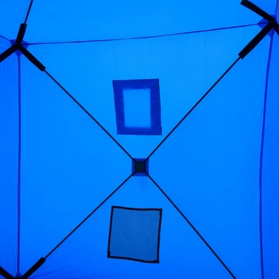 - Pop-Up Tent: Start ice fishing quickly with a pop-up ice fishing tent that’s easy to set up and close. Assemble and put away the fishing shelter by simply pulling up on the roof and then out on all four sides. The size supports 2-4 people with 33 square feet of fishable area.