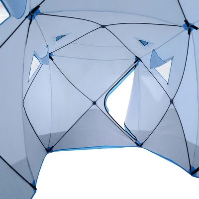 - GOOD VENTILATION: It is comfortable to sleep in this ice fishing tent. The tent includes two zippered doors on opposite ends and two-layer windows with oxford and transparent PVC windows to keep the cold out. This tent is easy to access and provides a well-ventilated set-up.