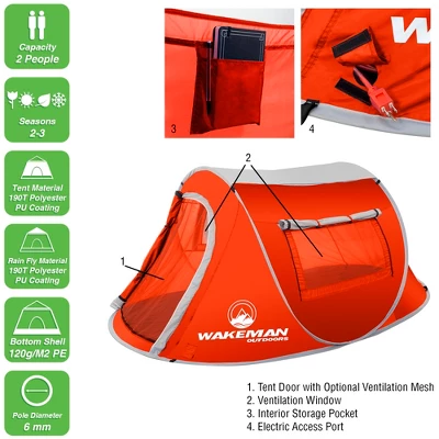 - SETS UP IN SECONDS- This lightweight2 person popup tent with large D-style door was designed for comfort, space and convenience. The automatic, instant setup removes all of the hassle of traditional tent-pitching so you can begin your trip stress-free.