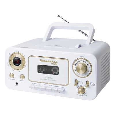 Classic retro design, the Studebaker SB2135BT has great features abound on this portable CD player with AM/FM radio and Cassette Player (Recorder), while also featuring Bluetooth to seamlessly stream music, podcasts and other audio from your Bluetooth devices. The top loading CD player is CD-R/RW compatible. The Cassette Player/Recorder has auto stop. Other great features include aux-in jack, condenser microphone and AC/DC operation. The built-in carrying handle makes this portable unit really portable.