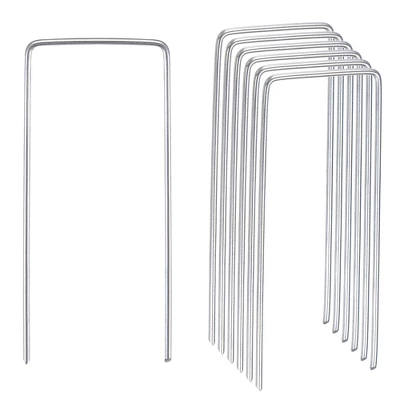 What is this?The garden stake adopts a U-shaped design, the pointed bottom makes pegs are easier to nail into the ground. Widely used in various places, such as garden, yard, outdoor lawn and so on to fix the gardening fabric, edging, artificial turf, tarp, geotextile, greenhouse, shade net, soaker hose, drip irrigation pipe and other landscaping projects. What to get?Color: Silver Tone;Type: U Shape;Material: Galvanized Iron;Overall Size: 10cmx4cmx0.2cm / 3.9″x1.6″x0.08″(L*W*Dia.);Package Content: 50 x Garden Stakes;Are there any advantages of the product? These galvanized garden stakes are waterproof, windproof, rustproof, durable and have a long service time. How to use it? Fix the garden spike on the ground using a hammer or hard object. If you want to take out it, you can use a hammer with a hook to pull it out. What to notice? Please be careful with your hands when using these garden stakes.